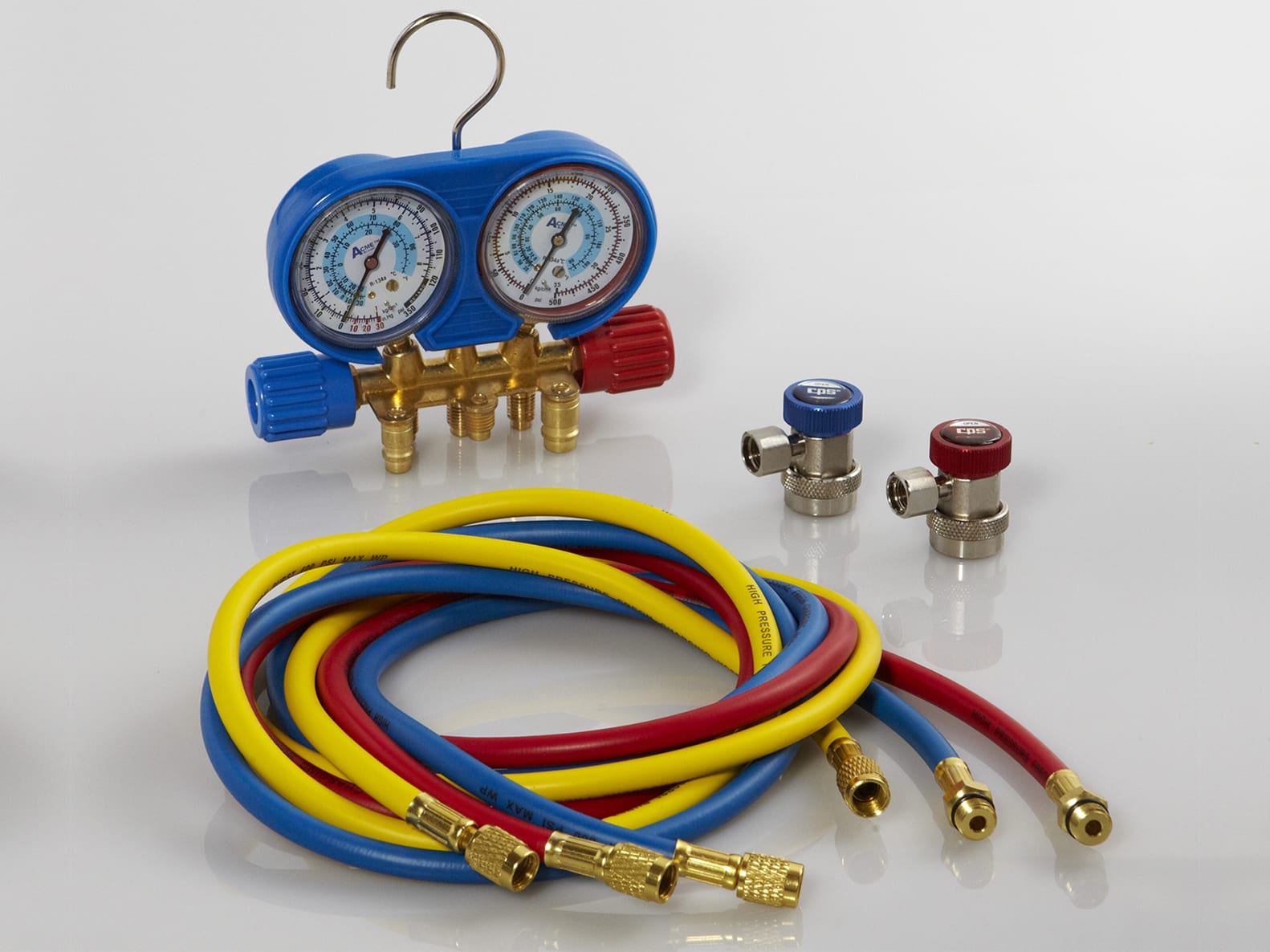 R134a brass manifold w/Blue protective boot, 60 ” hoses, and premium couplers