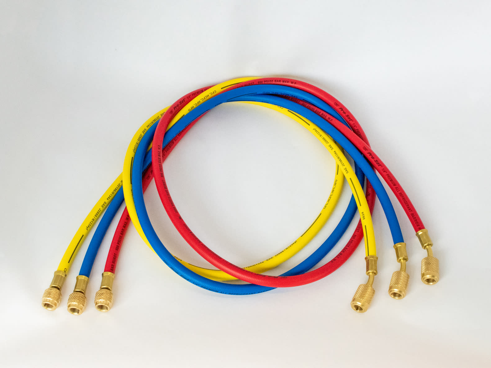 5′ (3-Pk) Premium Hoses, Yellow 1/4″ LHFM x 1/4″ ABB, Red & Blue 1/4 “FM x 1/4 “FM ABB