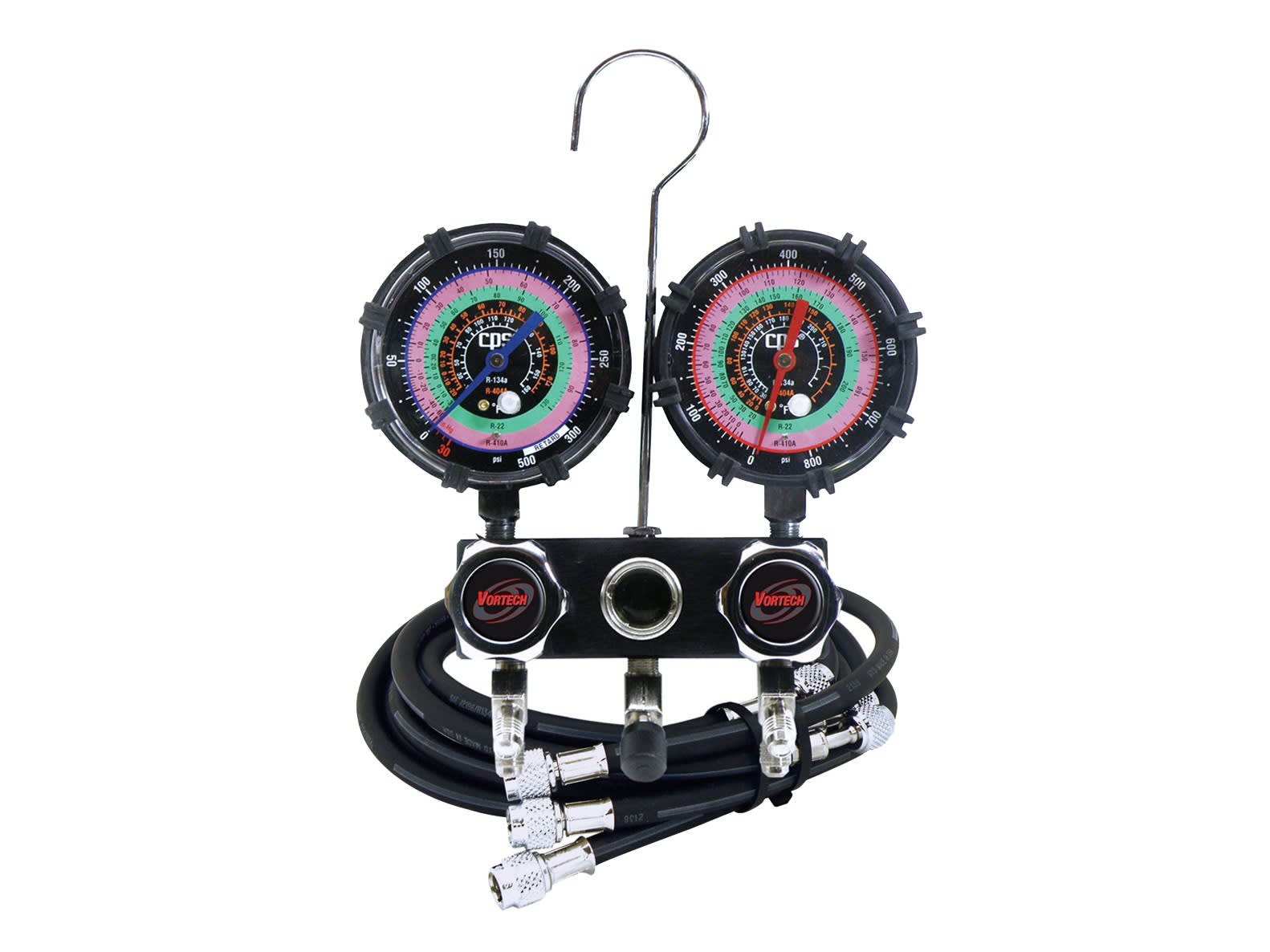 2-Valve Manifold, 1/4 in SAE Fittings, 3.125 in 1.0%R134a, R22, R404a, R410a Gauges, Vortech Valves (Manifold Only)