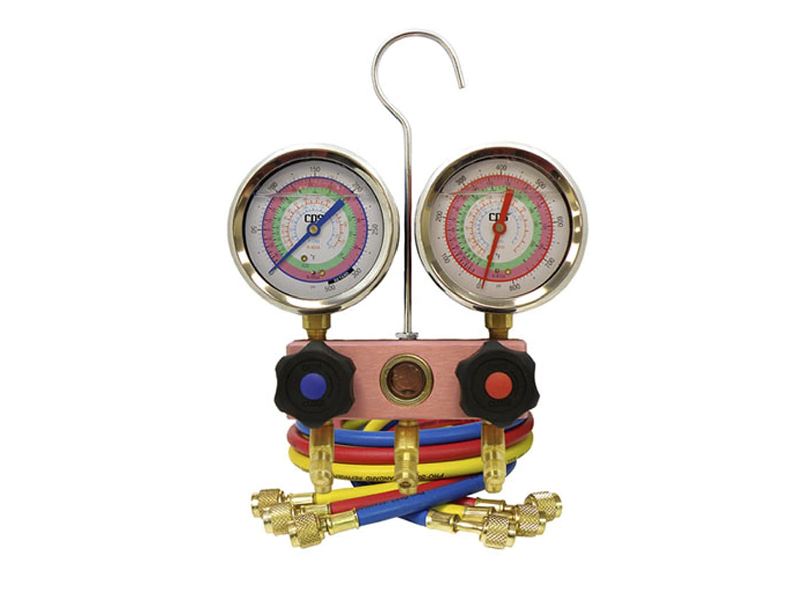 CPS Deep Vacuum Series 2-Valve Manifold, 1/4 in SAE Fittings, Vortech Valves – Premium Barrier Hoses- Pink Bodies R410a / 22 / 404A 3.125 in Oil-Filled Gauges & 5ft Premium Hoses