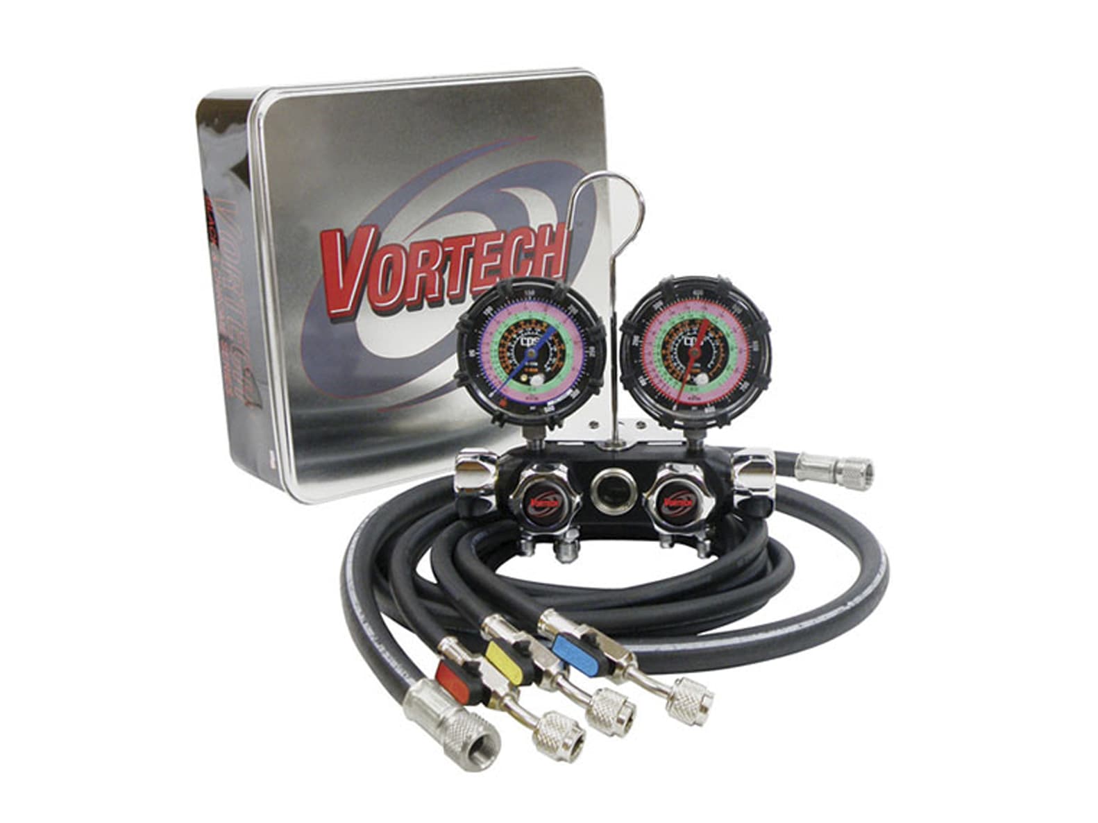 4-Valve Manifold, 1/4 in SAE Fittings, 3.125 in 1.0%R134a, R22, R404a, R410a Gauges, Vortech Valves (Manifold Only)