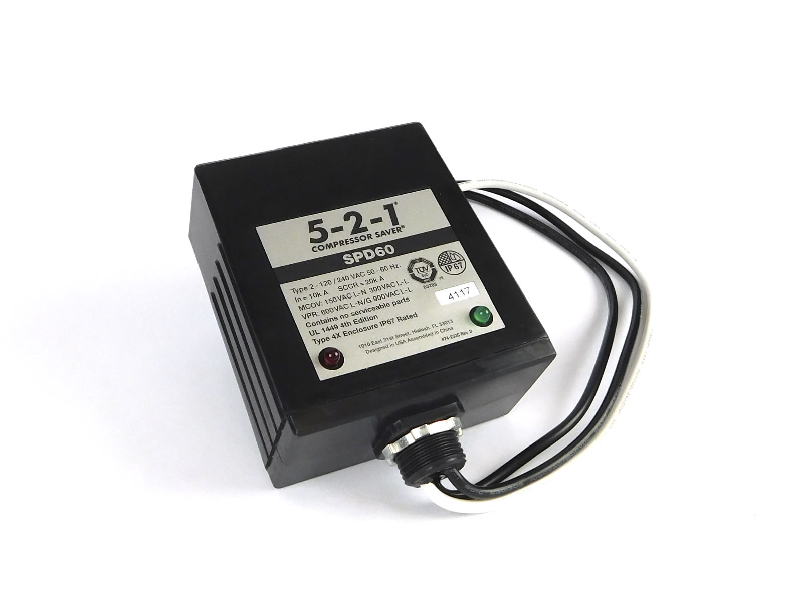 The 5-2-1 Compressor Saver® introduces the SPD60 Surge Protection device that incorporates the latest in protection technology and ease of installation. This device is designed to protect your equipment by suppressing the harmful energy produced by lightning strikes and other power line transients commonly found in HVAC installations. The voltage surges or spikes can be very damaging to HVAC equipment, shortening the life of the compressor and reducing its efficiency.