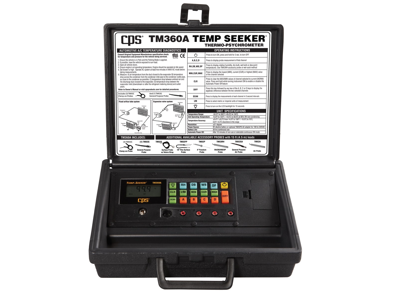 Designed in a rugged blow-molded polyethylene case, the TM360A is engineered to provide laboratory accuracy in rough shop/field environments. A generous probe storage area is provided to keep all your job-specific probes neatly housed. Note: Probes can remain plugged in during storage, reducing life-shortening stress on both the connection ports and the probe connector ends.